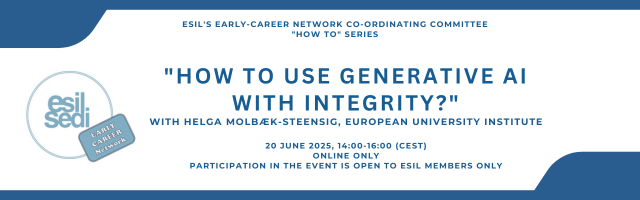 The theme is “How to use Generative AI responsibly” and the speaker is Helga Molbæk-Steensig (European University Institute). The event will be fully online and open only to ESIL members.